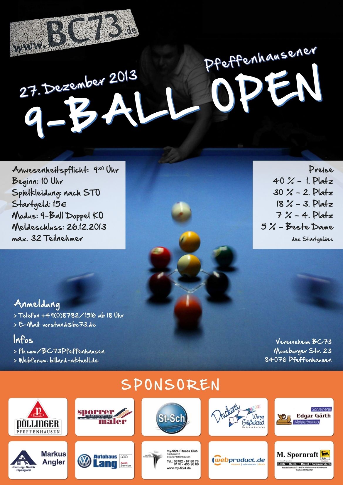 Pfeffenhausen. Bereits zum 13. Mal findet am 27. Dezember die Pfeffenhausener 9-Ball Open statt.Das Preisgeldturnier hat sich mittlerweile etabliert und die Meldelisten sind aufgrund der begrenzten Anzahl an Startplätzen immer sehr flott voll.