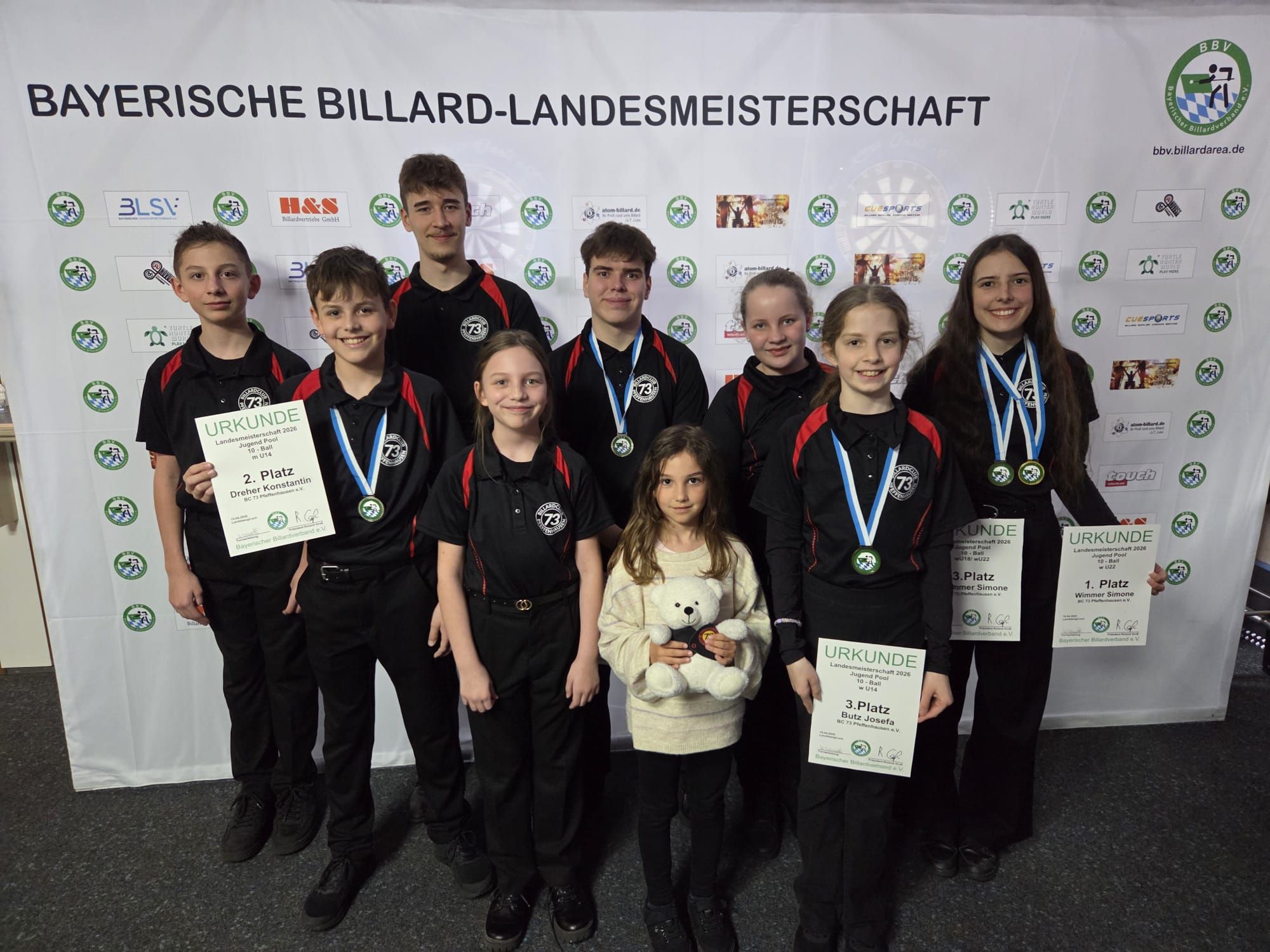 Vom 09.04. bis zum 12.04. fanden in Landsberg die Bayerischen Jugendmeisterschaften im 8-Ball, 9-Ball, 10-Ball und 14/1 endlos statt. Für den Billardclub 73 Pfeffenhausen gingen im 14/1 sieben Teilnehmer an den Start. Christoph Wimmer konnte sich am ersten Turniertag direkt die erste Goldmedaille in der mU22 holen. Des Weiteren holten sich die restlichen Spieler des BC73 noch dreimal Platz 5, einmal Platz 6 und einmal Platz 10. Am zweiten Turniertag nahmen im 10-Ball neun Spieler für den BC73 teil. Simone Wimmer holte sich hier die Goldmedaille in der wU22. Außerdem sicherte sich Christoph Wimmer die Silbermedaille in der mU22 und Konstantin Dreher die Silbermedaille in der mU14. Außerdem gab es für den BC73 noch zwei 3. Plätze, einmal Platz 4, einmal Platz 5 und zweimal Platz 7. Im 8-Ball starteten bei einen Starterfeld von 59 Teilnehmer sage und schreibe 15 Teilnehmer für den BC73. Christoph Wimmer sicherte sich in der mU22 seine zweite Goldmedaille des Turniers. Simone Wimmer holte sich in der wU22 die Silbermedaille. Zudem gingen zweimal Platz 3, fünfmal Platz 5, zweimal Platz 7, zweimal Platz 9 und zweimal Platz 10 an die Spieler des BC73. Am vierten und letzten Spieltag gingen im 9-Ball neun Spieler an den Start. Simone Wimmer holte sich in der wU22 die zweite Goldmedaille und Christoph Wimmer in der mU22 die zweite Silbermedaille des Turniers. Zudem gab es noch einen 3. Platz, einen 4. Platz, viermal Platz 5 und einmal Platz 6.